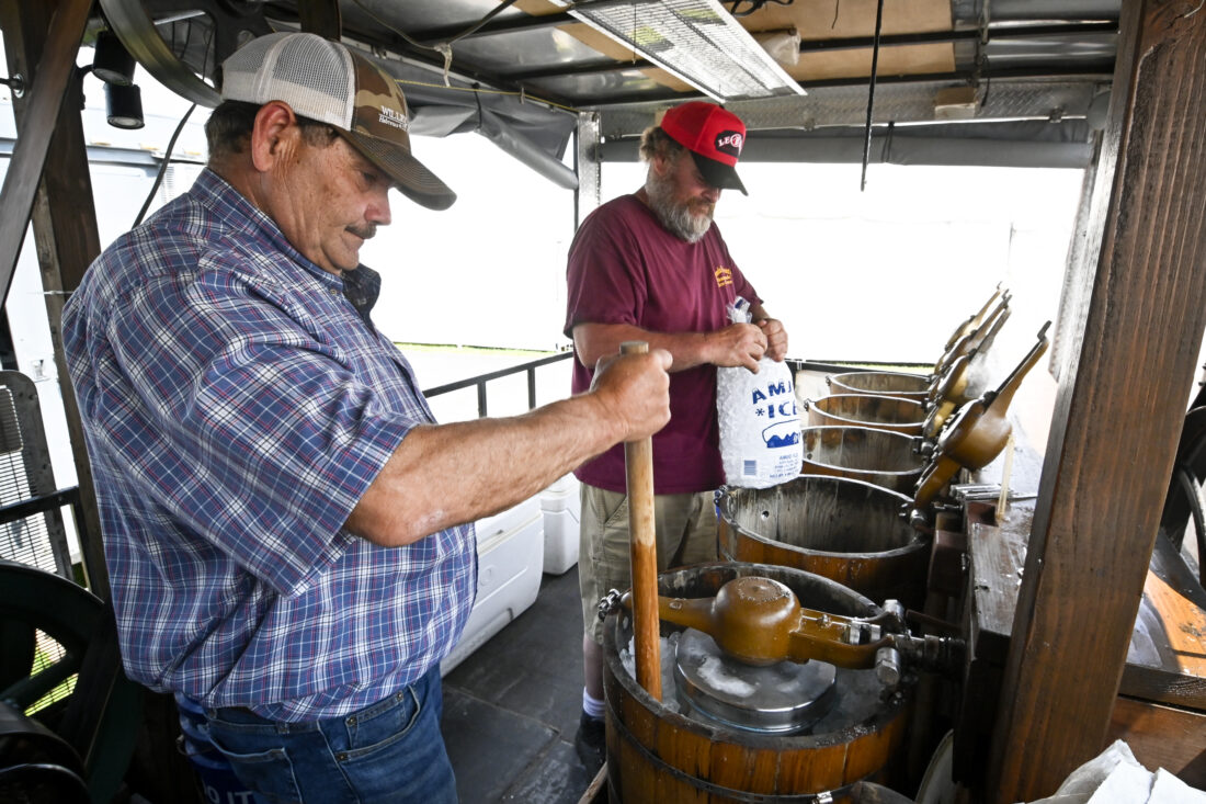 RALPH WILSON/Sun-Gazette Correspondent Scott Johnson packs down ice in a churn as Darrell Travelpiece gets more ready as the two make a batch of homemade ice cream in Johnson's customized trailer at the Lycoming County Fair. Powered by a 1925 Hit & Miss engine Johnson can create up to five flavors at a time. The resulting frozen treat is available in numerous flavors from Scott and his wife Glenda at the Lycoming County Fair.
