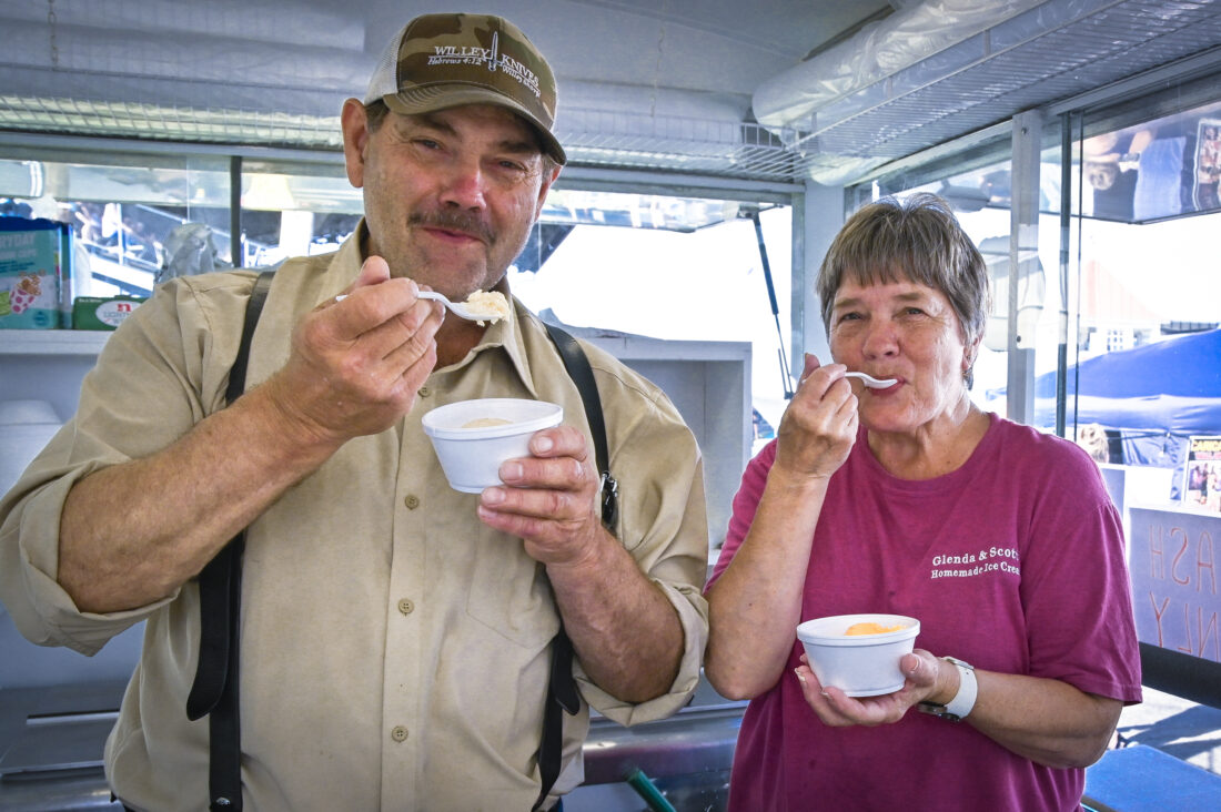 RALPH WILSON/Sun-Gazette Correspondent Scott and Glenda Johnson pose with dishes of their own homemade ice cream at their stand at the Lycoming County Fair. The couple are owners and operators of Glenda and Scott's Homemade Ice Cream and make their ice cream daily at the Fair.