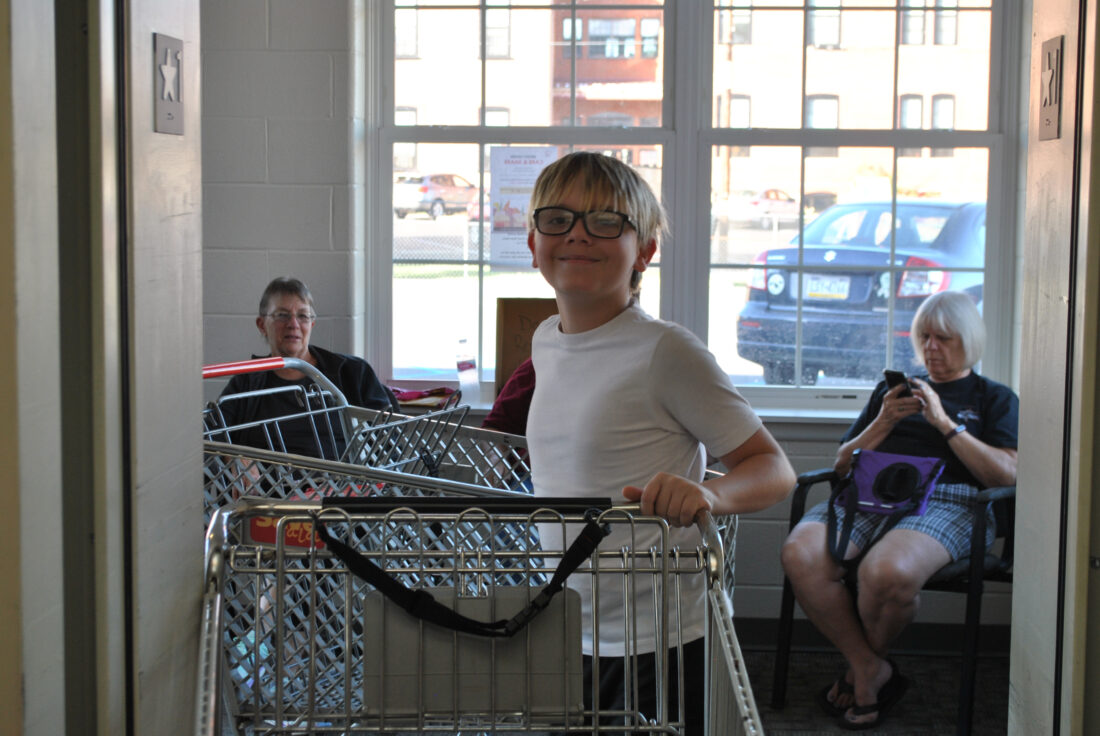 HUNTER SMITH/The Express Owen Dailey, 12, of Jersey Shore, helps load carts into the St. John Evangelical Lutheran Church elevator to bring them down to the food bank.