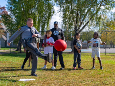 Trooper Robert Evanchick of Troop F boots a ball over the heads of players in the field during the Kickball with Cops event Saturday morning in Williamsport. The event brought together local law enforcement, Pa State Troopers, and members of the faith community along with kids from K through 5th grade at Firetree Place in downtown Williamsport.