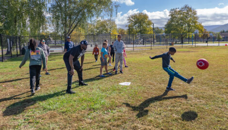 Shakir Faison, 8 of Williamsport, kicks the ball to players in the field during the Kickball with Cops event Saturday morning in Williamsport. The event brought together local law enforcement, Pa State Troopers, and members of the faith community along with kids from K through 5th grade at Firetree Place in downtown Williamsport.