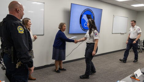 KAREN VIBERT-KENNEDY/Sun-Gazette Judge Nancy Butts hands the graduation certificate to MacKenzie Karasek of Susquehanna Regional EMS at the Lycoming/Clinton Crisis Intervention Team training graduation on Wednesday.