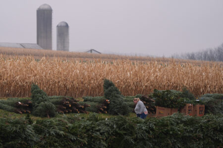 - A woman walks through stacks of Christmas trees at Buffalo Valley Produce Auction, Thursday, Nov. 20, 2025, in Mifflinburg, Pa. (AP Photo/Matt Slocum)