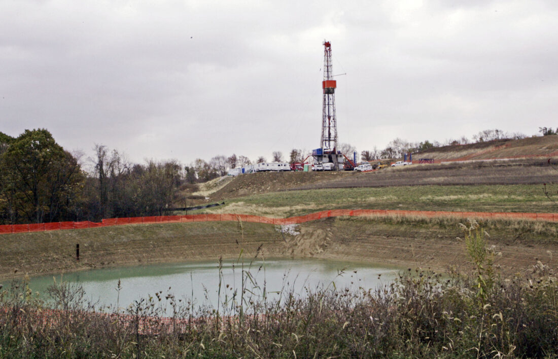 AP FILE PHOTO A drilling rig used to extract natural gas from the Marcellus Shale sits on a hill above a pond on John Dunn’s farm in Washington County in 2008.