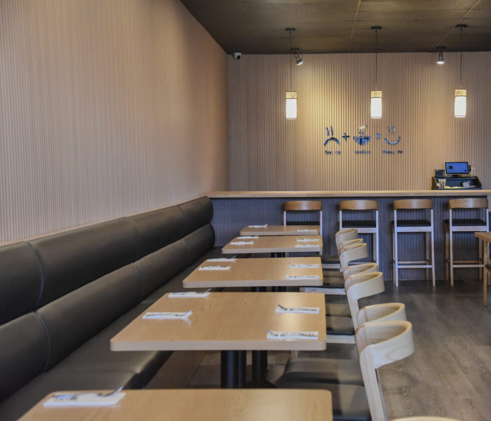 The mid-sized restaurant got a remodel before opening, which the couple did themselves. The space is minimalist with wood slats covering the walls. Decor is still being added but one wall proclaims with simple graphics, “Sad me + Noodles = Happy Me.” It’s a nod to how Zena and Max characterize the food.