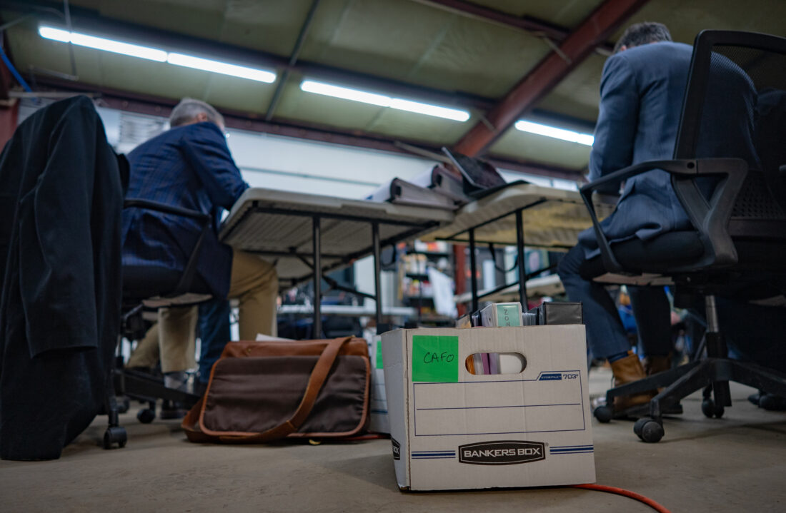 A box labeled “CAFO” filled with documents sits next to Samuel Wiser, attorney for the applicant, during the conditional use hearing by the Muncy Creek Township Supervisors in Muncy. DAVE KENNEDY/Sun-Gazette