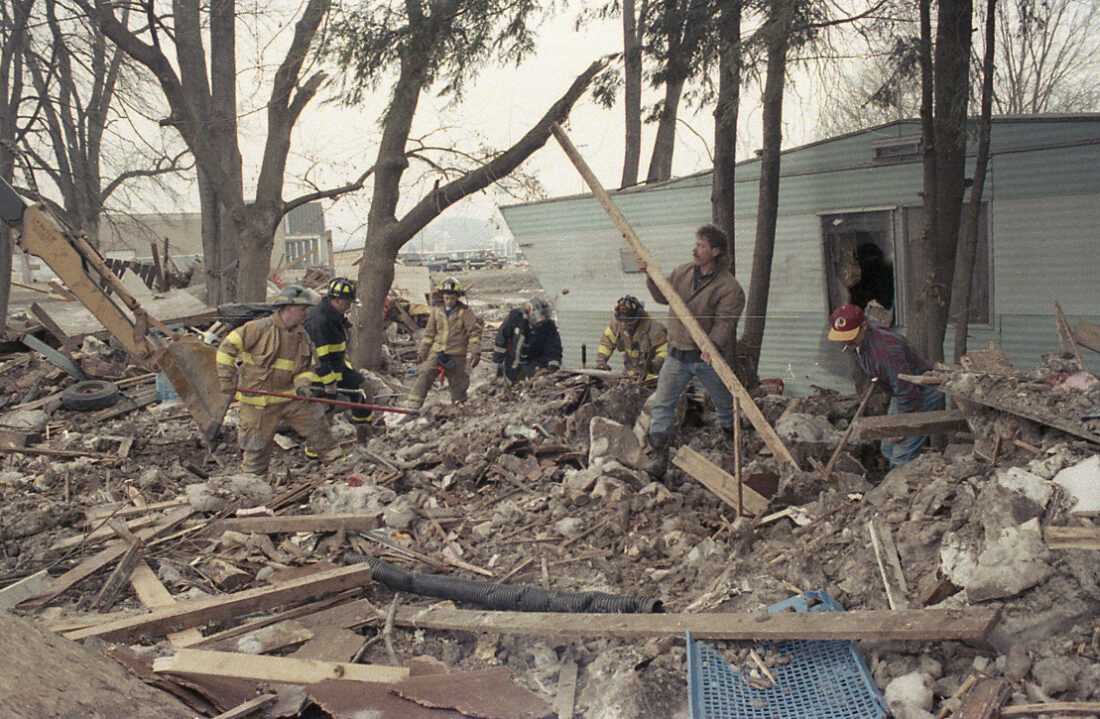 SUN-GAZETTE FILES The Winter Flood of 1996 caught many people off guard. Who would have thought that, after watching 4 feet of snow pile up by mid-January, that the temperature would spike and 4 inches of new rain would fall to create one of the most significant floods in Lycoming County history? In top photo, firefighters and others search through flood debris. In the days that followed the flood, hundreds of people were listed as unaccounted for. The search was officially called off when the last missing person was confirmed as found.