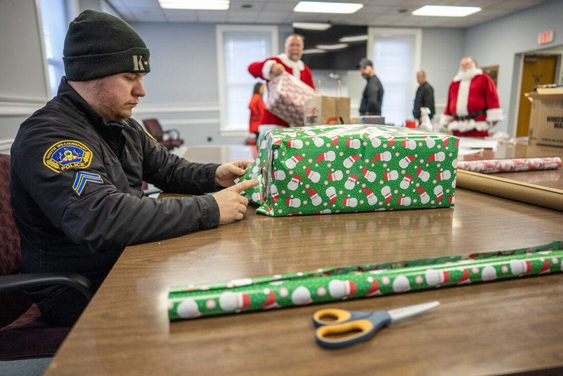 - Cpl. Seth Stropp of the South Williamsport Police Dept. wraps up Christmas presents early Christmas Eve morning to be distributed by members of the department and volunteers. DAVE KENNEDY/Sun-Gazette