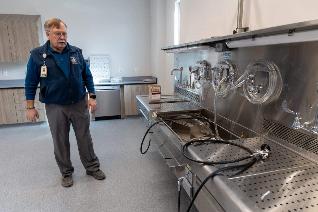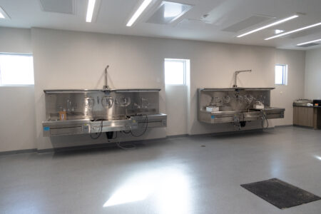 There is space to house and clean vehicles; a place for staff to clean up, themselves and their clothes, if needed; ample room to store bodies in refrigerated areas; and a CAT scan to aid in identifying medical conditions non-invasively. There is also a large room with everything needed to do autopsies. The only thing missing is a forensic pathologist to perform those autopsies.