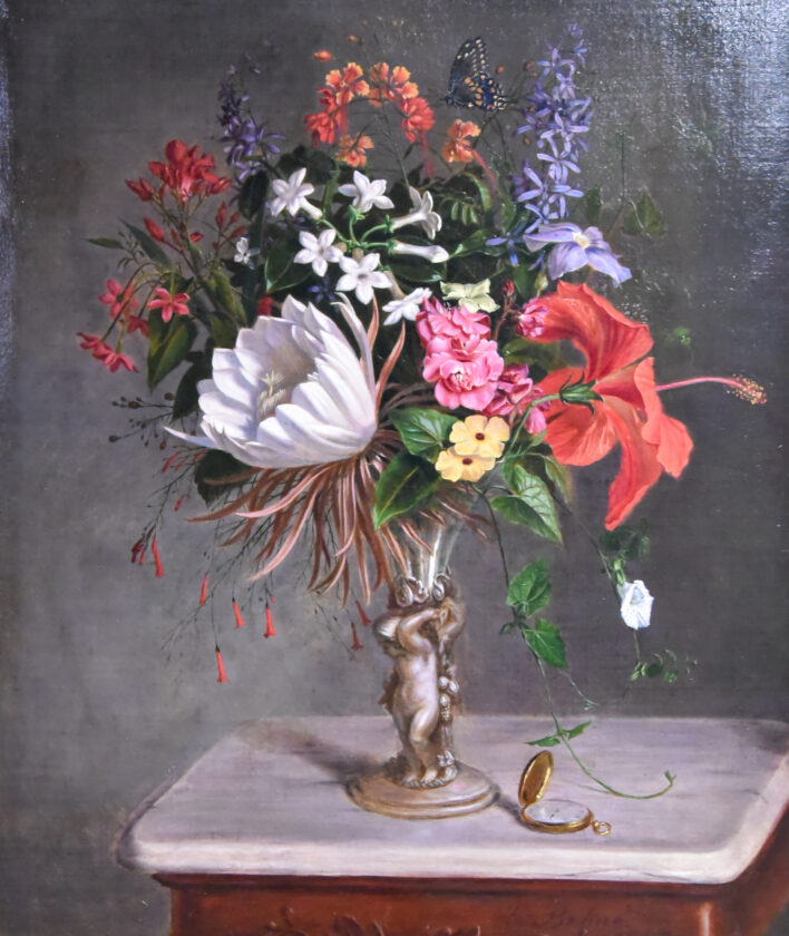 When asked about his favorite painting in the exhibit, Milligan replied, “That is like asking, “Who is your favorite grandchild?’ But it is a Behne painting. He lived in Philadelphia but escaped the Civil War and went to Cuba. [The painting] shows the hibiscus and is a Caribbean looking painting. I love the watch and you wonder what he is trying to communicate to us.”