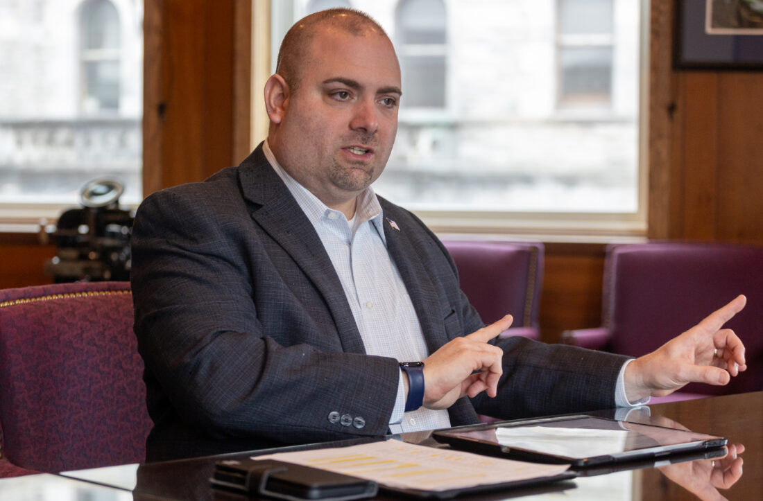 KAREN VIBERT-KENNEDY/Sun-Gazette State Rep. Joe Hamm, R-Hepburn Township, talks about the governor's proposed budget during a meeting with the Sun-Gazette's Editorial board in Williamsport.
