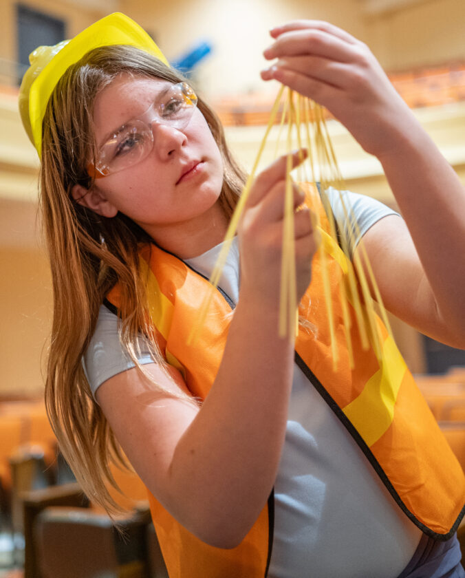 - Emily Downard, 10 of Williamsport, builds a tower out of dry spaghetti and a marshmallow during a construction day event at Curtin Intermediate School in Williamsport. Students from the Penn College of Technology’s Construction Management program ran the program with the students as part of the “capstone project.” DAVE KENNEDY/Sun-Gazette