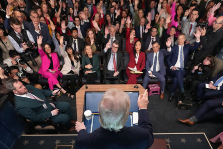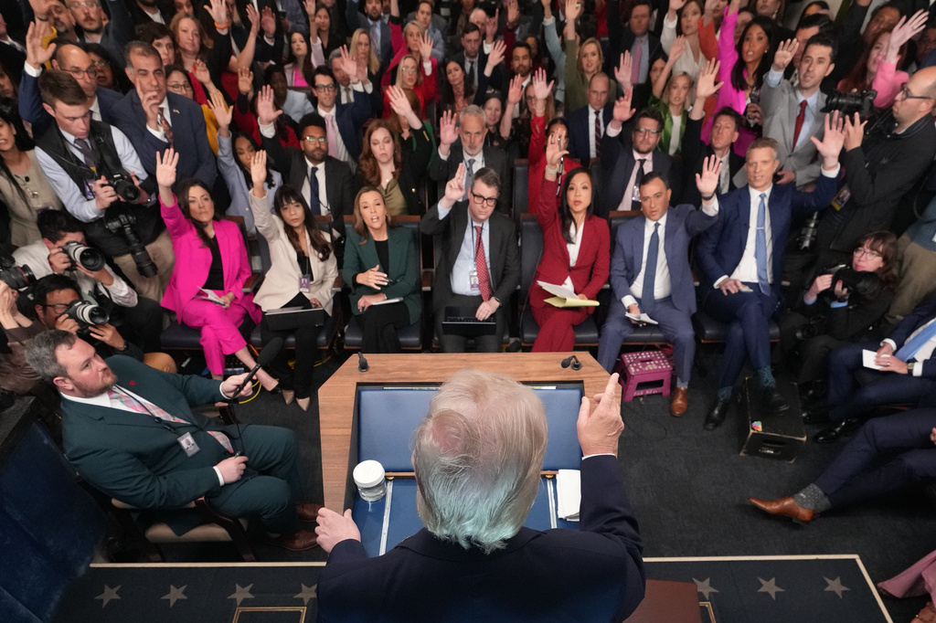 President Donald Trump speaks with reporters during a news conference in the James Brady Press Briefing Room at the White House, Monday, April 6, 2026, in Washington. (AP Photo/Mark Schiefelbein)