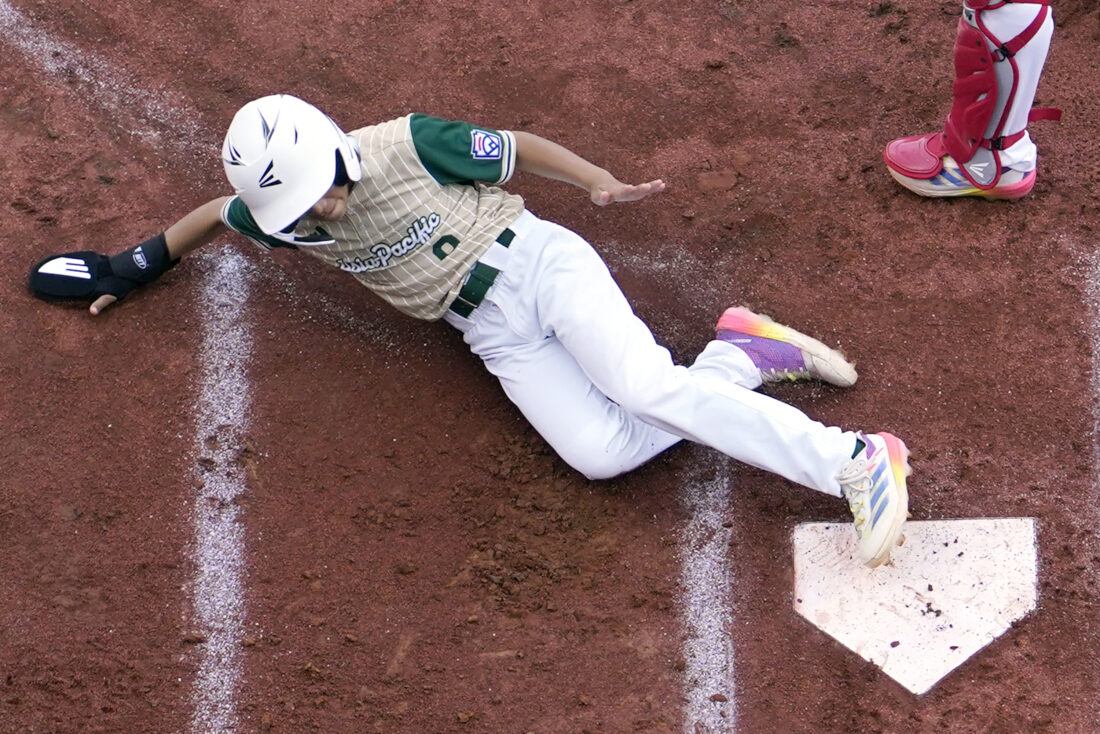 Taiwan's Ciou Zhi-Kai (8) slides into home past Jscoring on Yu Chia-Jui's double against Japan during the first inning of a baseball game at the Little League World Series tournament in South Williamsport, Pa., Wednesday, Aug. 21, 2024. (AP Photo/Tom E. Puskar)