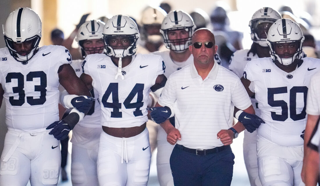 Penn State head coach James Franklin lead his team onto the field during an NCAA college football game against UCLA Saturday, Oct. 4, 2025, in Pasadena, Calif. (AP Photo/Marcio Jose Sanchez)