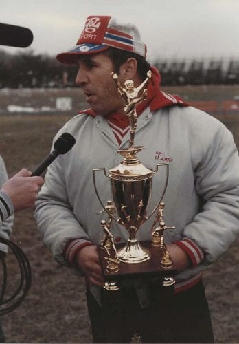 Williamsport football coach Tim Montgomery holds the Eastern Conference Championship trophy after defeating Mount Carmel, 38-0, on November 29, 1986. The Eastern Conference Championship was the highest attainable honor at the time due to no state championship. Montgomery, who led Williamsport to a 165-93-3 record in his nearly 25 years as coach, passed away Thursday.