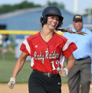 RALPH WILSON/Sun-Gazette Correspondent Montgomery's Taylor McRea reacts as she rounds the bases after hitting a home run during a Class A state playoff game against Montgomery on Monday at Central Columbia. Montgomery won 7-0.