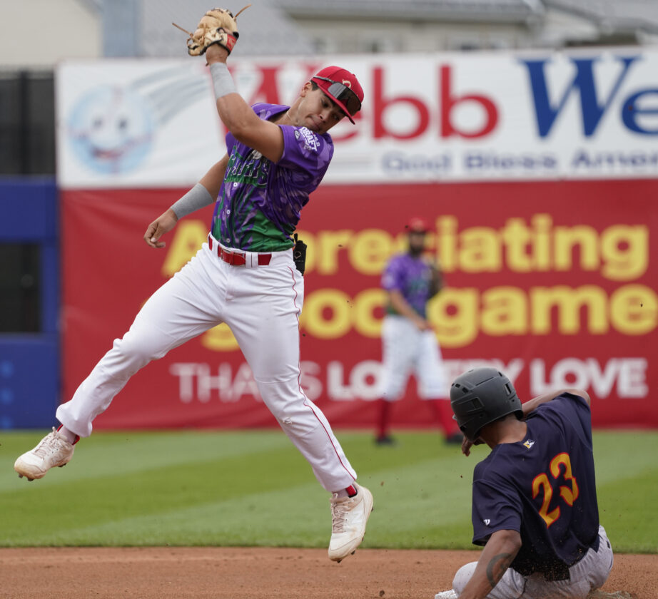 - Crosscutters second baseman Isaac Nunez tries to make the tag on Jordan Williams of the State College Spikes in the first inning at Muncy Bank Ballpark, July 8, 2022. DAVE KENNEDY/Sun-Gazette