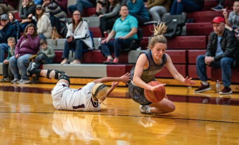 Natayah Abdul-Hakim (1) of Loyalsock and Kelsey Hoffman (15) of Warrior Run dive for a loose ball at Loyalsock High School Jan. 6, 2023. DAVE KENNEDY/Sun-Gazette