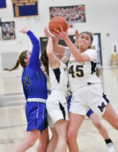 - MARK NANCE/Sun-Gazette Correspondent Montoursville’s Ashlynn Loe looks to grab a rebound as South’s Aleigha Rieppel defends during Wednesday’s game at Montoursville.