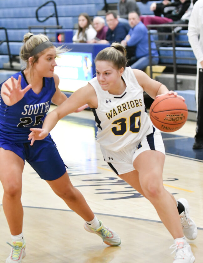 After scoring those points, Minier kicked the ball out when the defense collapsed on her and found Kriebel for a basket, capping a 7-0 run and putting South ahead by 13. Early in the fourth quarter, Minier found Rieppel open behind the arc and the senior guard drained a 3-pointer, giving South a 36-21 lead. Minier then went defensive, intercepted a pass and went coast-to-coast for a layup midway through the fourth quarter, making it, 38-23. The Warriors did not pull any closer until the game’s closing seconds.