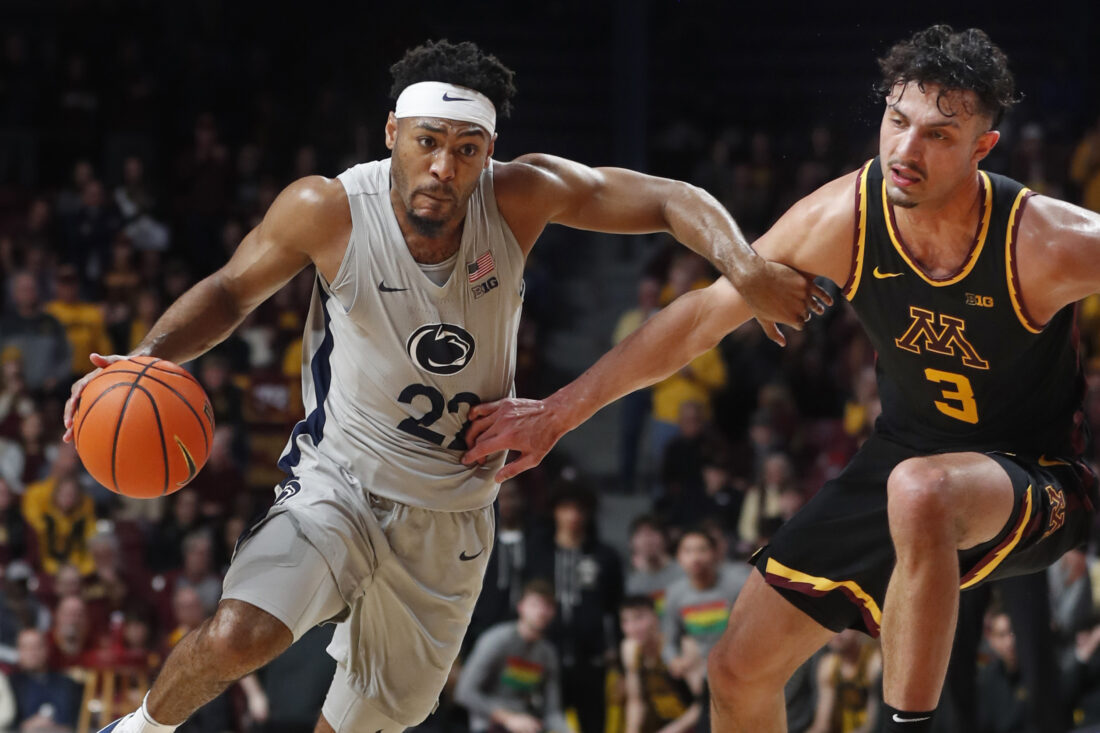 Penn State guard Jalen Pickett, left, works around Minnesota forward Dawson Garcia in the second half of an NCAA college basketball game Saturday, Feb. 18, 2023, in Minneapolis. (AP Photo/Bruce Kluckhohn)