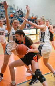 Peyton Dincher of Jersey Shore tries to pass out of the defense of Central Columbia Friday night at Milton High School March 3, 2023. Central won 51-30. DAVE KENNEDY/Sun-Gazette