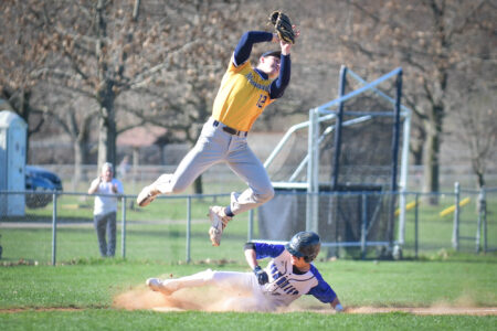 - RALPH WILSON/Sun-Gazette Correspondent South Williamsport’s Caleb Neidig (1) attempts a tag as Montoursville’s Cael Frame dives back to second in time during a high school baseball game on Monday at South Williamsport. South won 9-4.