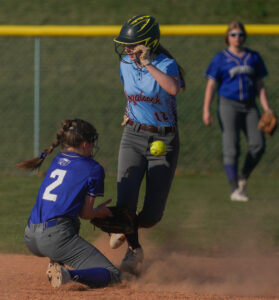 Anna Luxenburger of Loyalsock is safe at second base as Maura Woland of Warrior Run tries to make the tag at Warrior Run High School April 13, 2023. Loyalsock won 14-1. DAVE KENNEDY/Sun-Gazette