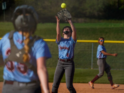 Pitcher Lydia Kresock of Loyalsock catches a pop up for an out hit by Lakesha Hauck of Warrior Run in the third inning at Warrior Run High School April 13, 2023. Loyalsock won 14-1. DAVE KENNEDY/Sun-Gazette