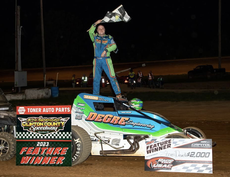 Steven Drevicki of Reading topped the field of twenty-seven USAC East Coast Sprint Cars on Friday night at the Clinton County Speedway. Tommy Dawson won the pro stocks, Jeffrey Weaver won the 270 micro sprints, Tommy Kunsman won the wingless 600 micros and John Stringfellow won the four cylinders.