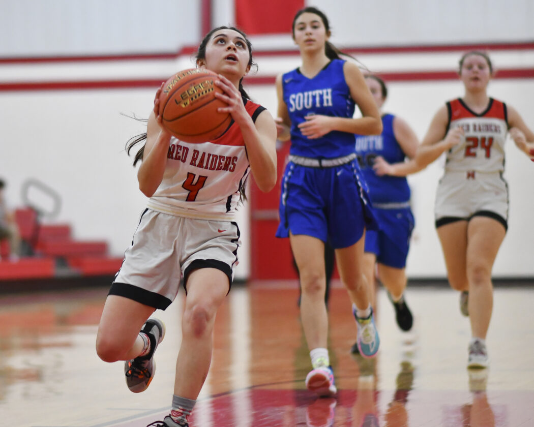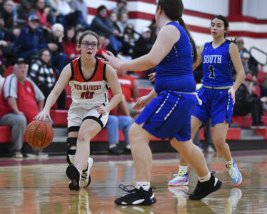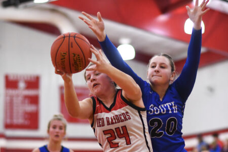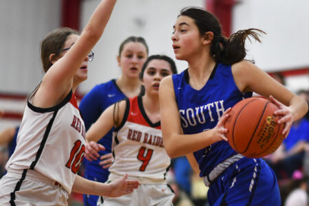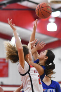 Everything worked in the third quarter as Moore scored 10 points and Apker six. Akers twice found Moore for 3-pointers, Apker asserted herself inside and Moore (6 rebounds, 5 assists, 4 steals) put South up 40-20 when she went coast-to-coast for a layup while drawing a foul. Moore and Akers were standouts on South’s soccer team which repeated as district champions last fall and their chemistry was evident throughout the third quarter as they contributed to 20 points, whether through scoring or via assists.