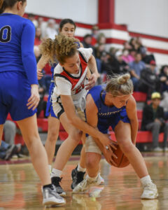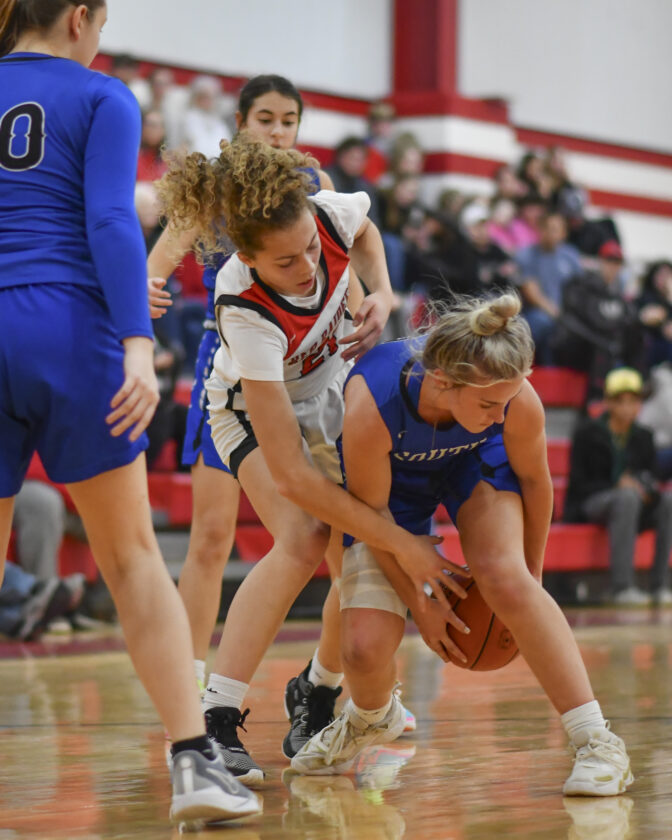 RALPH WILSON/Sun-Gazette Correspondent Montgomery's Rubi Salano (21) reaches for a loose ball as South Williamsport's Ella Moore tries to maintain control during a girl's high school basketball game at Montgomery on Friday, Jan. 26, 2024. South won 48-31.