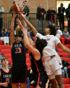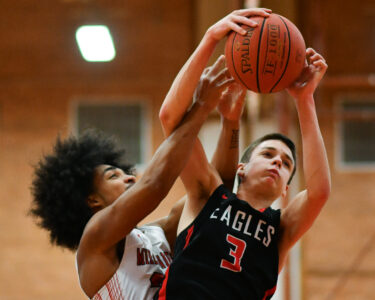 RALPH WILSON/Sun-Gazette Correspondent Williamsport's Alonzo Rice tries to grab a rebound away from Cumberland Valley's JJ Lebo (3) during a high school boy's basketball game on Saturday, Jan. 12, 2024 at Williamsport. CV won 67-50.