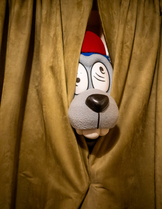 Crosscutters mascot Boomer peaks through a curtain before going out to meet fans during the 2025 Williamsport Crosscutters Hot Stove Banquet at the Genetti Hotel. DAVE KENNEDY/Sun-Gazette