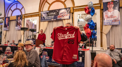 Hall of Fame pitcher Mike Mussina’s Stanford University jersey is auctioned off during the 2025 Williamsport Crosscutters Hot Stove Banquet at the Genetti Hotel. DAVE KENNEDY/Sun-Gazette
