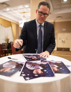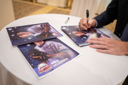 Hall of Fame pitcher Mike Mussina signs photos of himself during the 2025 Williamsport Crosscutters Hot Stove Banquet at the Genetti Hotel. DAVE KENNEDY/Sun-Gazette