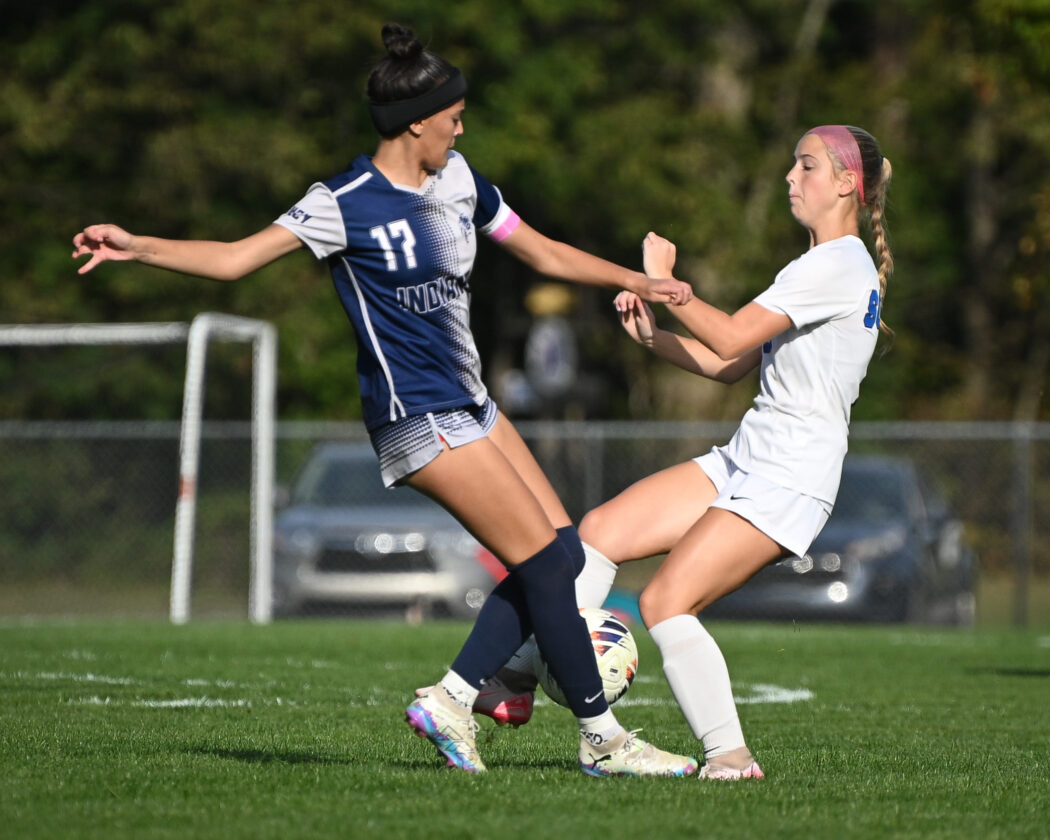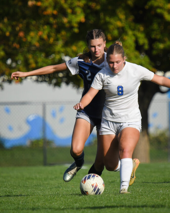 - RALPH WILSON/Sun-Gazette Correspondent Muncy’s Ella Nagel (17) and South’s Kendall Smith (6) struggle for possession of the ball during a high school girls soccer game between Muncy and South Williamsport at Muncy on Tuesday.