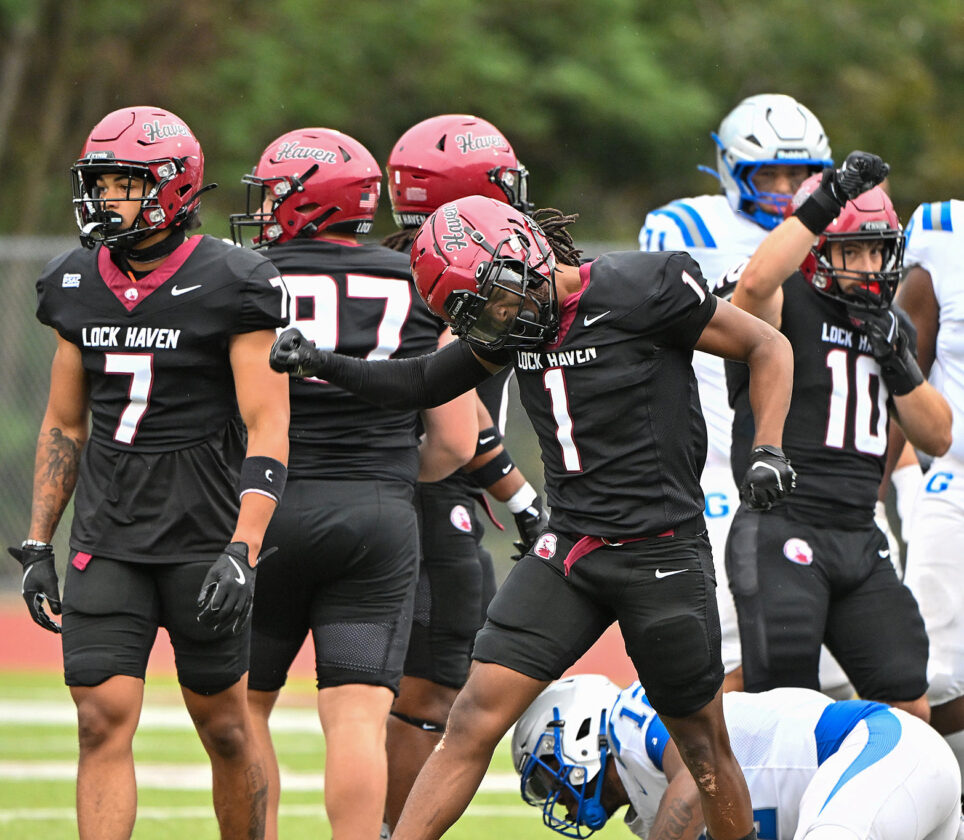TIM WEIGHT/Special to the Sun-Gazette Lock Haven defensive back Markel Morgan (1) celebrates a stop during a football game against Glenville State on Saturday, Sept. 6, 2025, at Hubert Jack Stadium. Morgan came up with the game-sealing INT in Saturday's win over West Chester.