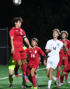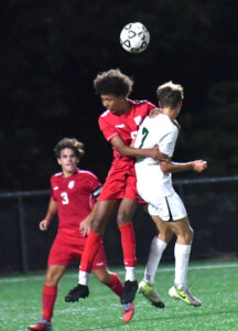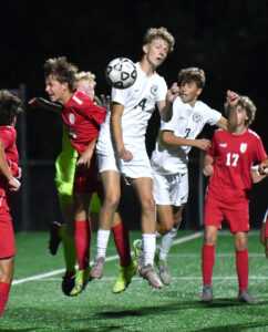 - MARK NANCE/Sun-Gazette Correspondent Williamsport’s Brock Lehr (5) and Lewisburg’s Jack Kohl (7) try to head the ball in the first half.