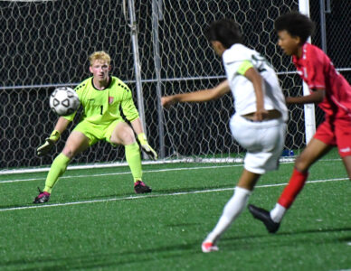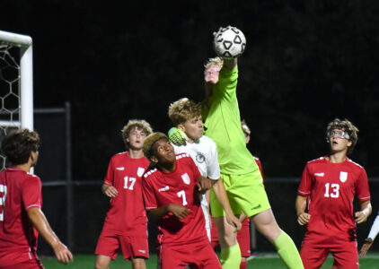 - MARK NANCE/Sun-Gazette Correspondent Williamsport goal keeper Maxwell Fink bats down the ball over Lewisburg’s Logan Kitchens on a corner kick in the first half.