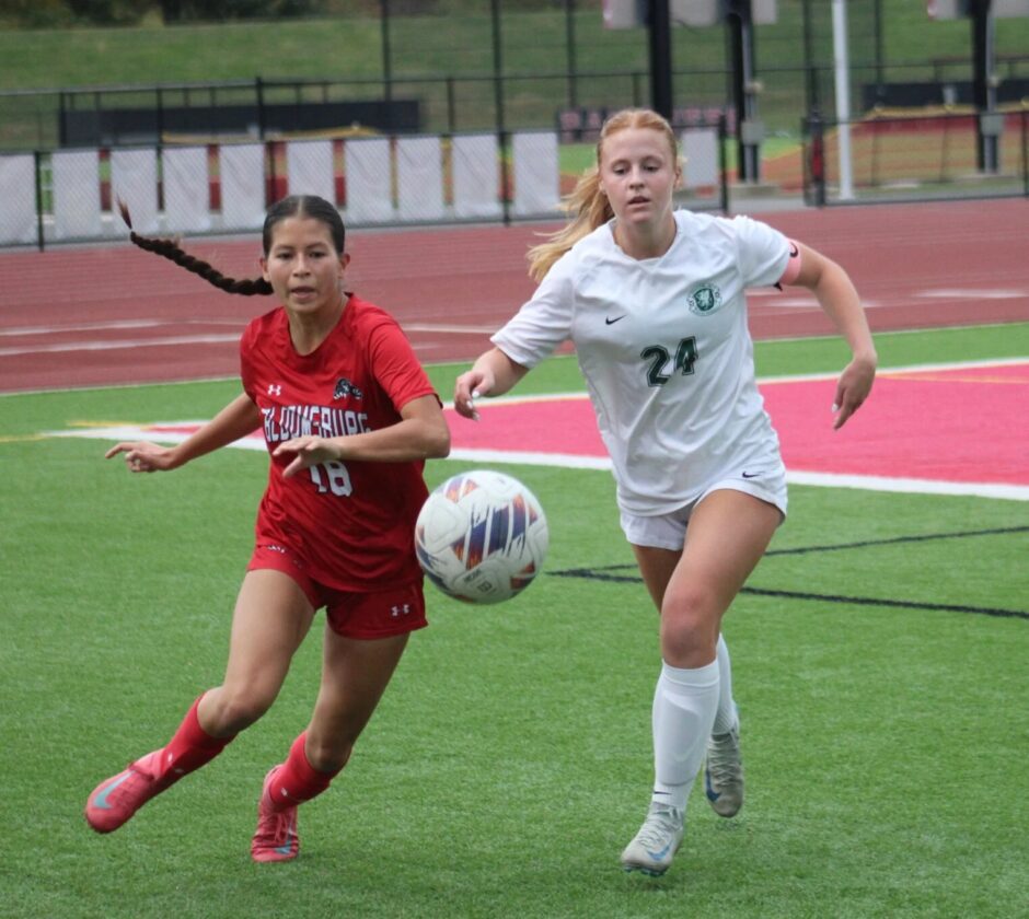 - CJ DOEBLER/Special to the Sun-Gazette Lewisburg’s Claire Driver battles with Bloomsburg’s Ally Bang for possession of the ball during the Green Dragons’ 4-1 win over the Panthers on Tuesday.