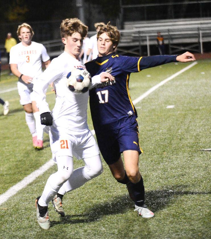 - KURT RITZMAN/Special to the Sun-Gazette Montoursville’s Gian Carmine and Lourdes Orrin Mariano compete for a ball during Wednesday’s District 4 Class AA playoff game.