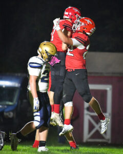 - RALPH WILSON/Sun-Gazette Correspondent Montgomery’s Briar Persing (22) and Parker Persing celebrates a touchdown during a high school football game against Northwest Area at Montgomery on Friday.