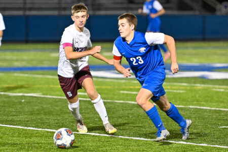 - TIM WEIGHT/Special to the Sun-Gazette Central Mountain’s Griffin Confer (23) battles for possession during a boys soccer game against Shikellamy on Wednesday, Oct. 1, 2025, at Central Mountain. The Wildcats won 4-0.