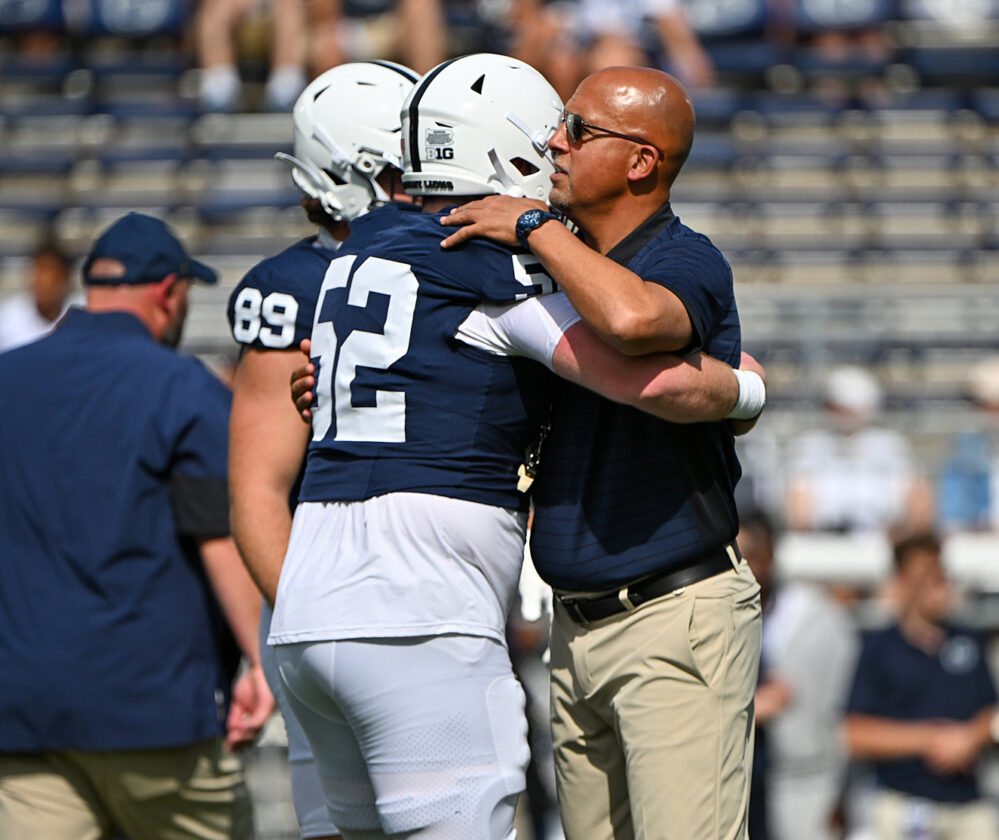TIM WEIGHT/Special to the Sun-Gazette Former PSU head coach James Franklin hugs one of his players before a game against Villanova on Saturday, Sept. 13, 2025, at Beaver Stadium in State College.