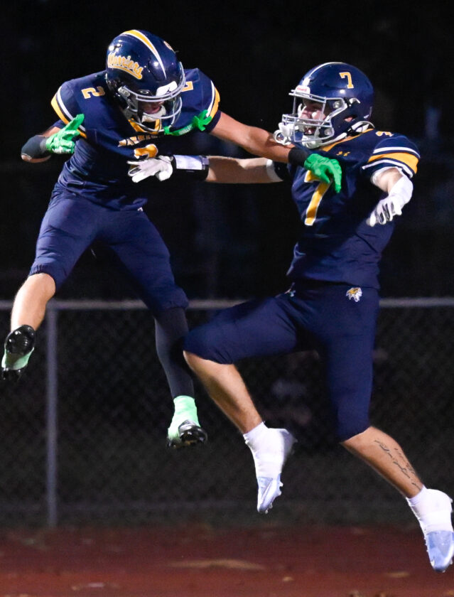 RALPH WILSON/Sun-Gazette Correspondent Montoursville's Jay Houseknecht (2) and Kane Moore (7) celebrate Moore's touchdown during the first half of a high school football game against Central Columbia at Montoursville on Friday.