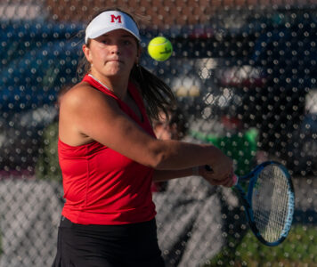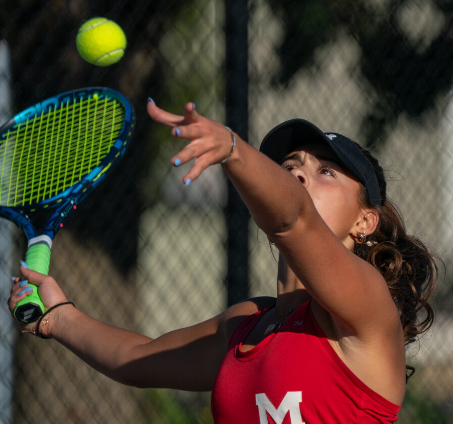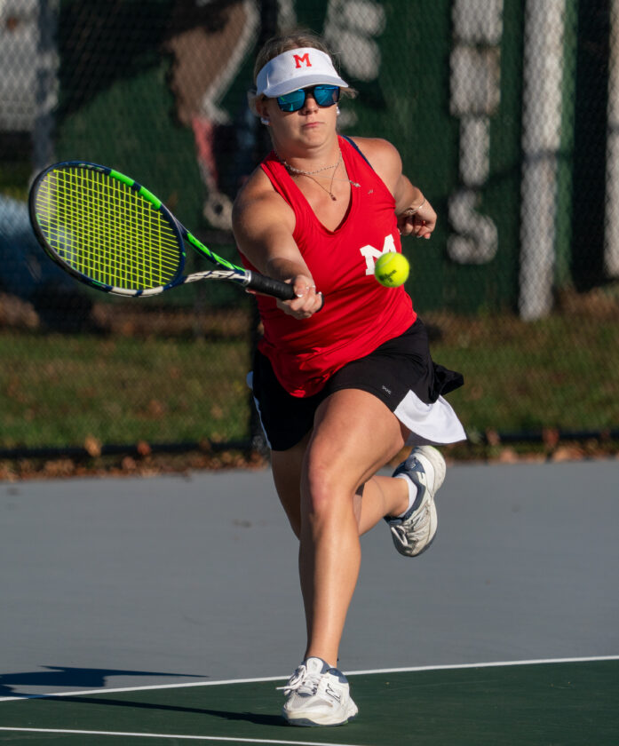 1. Georgia Randall (H) led Cali Barnes, 3-6, 6-3, pulled; 2. Madisyn Miller (M) led Rebecca Roberts, 7-6 (7-3), 1-2, pulled; 3. Talia Sakes (H) def. Ava Hartman, 6-1, 6-0.
