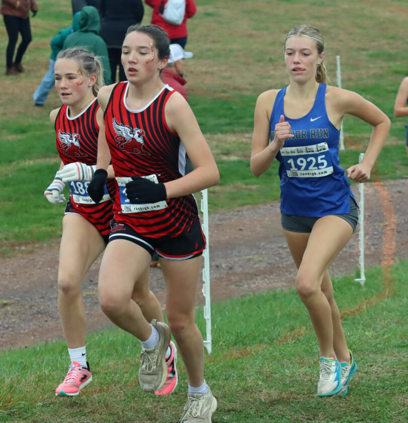 - CHRIS MANNING/Sun-Gazette Correspondent Sullivan County’s Zoey Reese and Addisyn Temple lead Warrior Run’s Keiara Shaffer compete at the District 4 cross country championships.