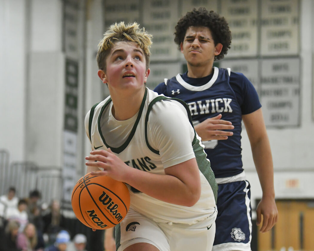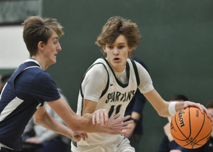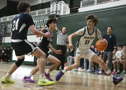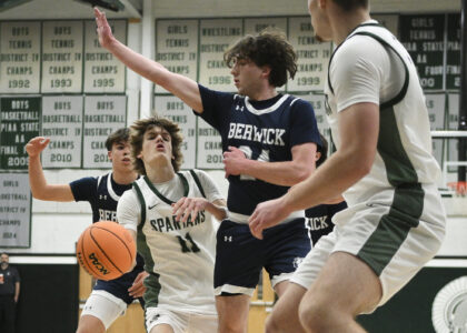Equally important, Knarr was a calming influence for a team with three new starters, two a freshman and sophomore. He was potent from outside, off the dribble and/or setting up teammates. Possessing, length, quickness and vision, he helped Hughesville carve up Berwick as the game continued, the Spartans scoring it, 35-22 in the second half.